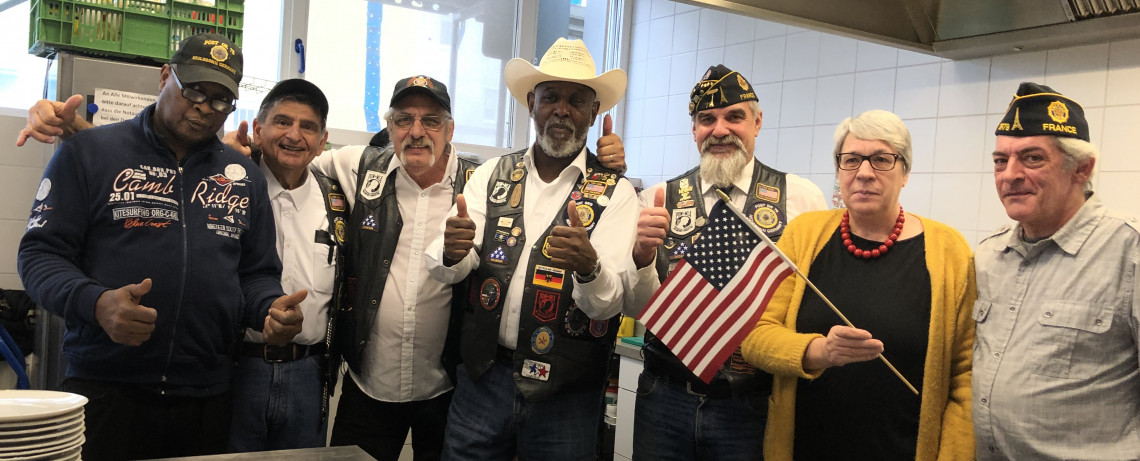 Sie heißen Casby, Don, Lee, John, Henry, Shepard, JJ, Crazy Dave und Charlie Brown, und kochen seit neun Jahren am 2. Weihnachtsfeiertag für die Besucher des Gildetreffs im uwi26 (Wilhelmsstraße 26). Auch in diesem Jahr rückten die neun wieder um 10 Uhr mit Rollups, amerikanischen und deutschen Fähnchen für die Tischdekoration und vor allem mit köstlichem Essen an. Das Nontett war bestens gelaunt und vorbereitet, und alle neun Herren versichern, dass sie selbst - und nicht etwa ihre amerikanischen oder deutschen Ehefrauen - Hand angelegt, gekocht und gebacken haben. Die „Köche und Bäcker“ der Amercian Legion –fast alle ehemalige Besatzungssoldaten, die in Deutschland ihre Heimat fanden – haben für eine Hundertschaft gekocht. Und fast so viele sind auch gekommen, um die leckere amerikanische Küche mit schmeckbar schwäbischen Einflüssen zu genießen! Zum traditionellen amerikanischen Truthahn, diesmal rund 45 kg, gab’s Gemüse, Spätzle und verschiedene Salate, inklusive klassischem deutschen Nudelsalat.Hinter vorgehaltener Hand verraten die neun, dass ihre ganze Leidenschaft aber den „Spätzle mit Soß“ gilt. „Richtig lecker“ bestätigten die vielen Gäste und fühlten sich „wie zuhause“, sobald die American Legion-Mitglieder in ihrem unnachahmlichen Slang fragten: “Noch etwas S-pätzle mit Soß“?Abgerundet wurde das köstliche Mahl selbstverständlich mit dem berühmtesten aller amerikanischen Softdrinks.Für die Besucherinnen und Besucher in der Tagesstätte der Aufbaugilde-Wohnungslosenhilfe war es ein wunderbarer Mittag, denn nach dem Festessen gab’s für alle auch noch Christstollen, Kuchen und Schoko-Nikoläuse. “Thank you, boys, you were really great!“ schallte es zum Abschied durch den Raum und alle hoffen, dass es am 2. Weihnachtsfeiertag 2020 ein Wiedersehen gibt.