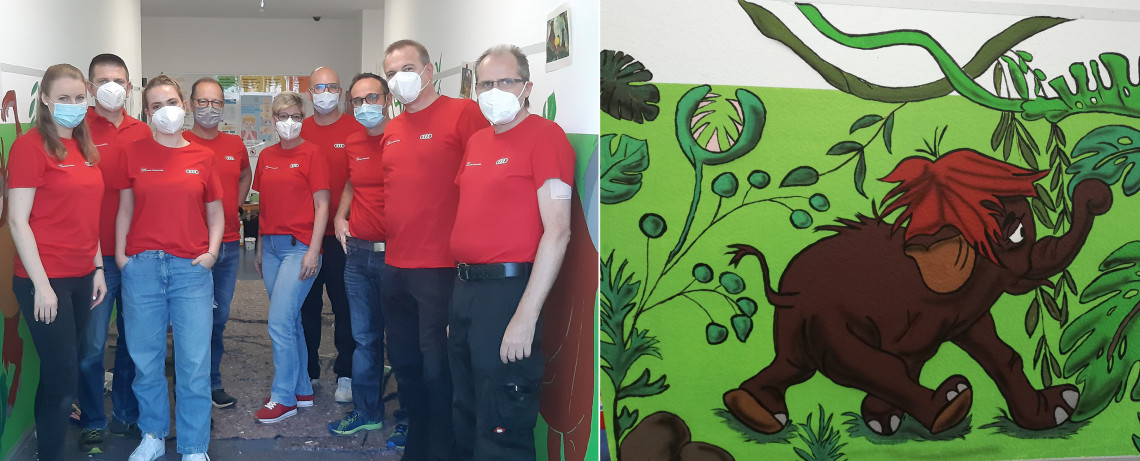 "Super, hier sieht's ja fast aus wie im Dschungel". Für die Kinder in der Kinderkrippe des Bildungsparks beginnen die Besuche künftig morgens mit einem Abenteuer, denn dank einem Team von Audi-Mitarbeiter*innen entstand im Eingangsbereich ein toller Dschungel. Möglich machte dies ein Projekt beim Audi-Freiwilligentag. In rund 50 Projekten haben sich mehr als 250 Audi-Mitarbeiter*innen, unter ihnen auch Mitglieder des Vorstands, Werkleiter und Betriebsräte, in ihrer Freizeit für soziale Einrichtungen eingesetzt. Das Audi-Team im Bildungspark verschönerte den Krippen-Eingangsbereich für unsere kleinen Gäste so liebevoll, dass die Kinder hier jedesmal mit strahlenden Augen davorstehen. Dafür ganz herzlichen Dank!
